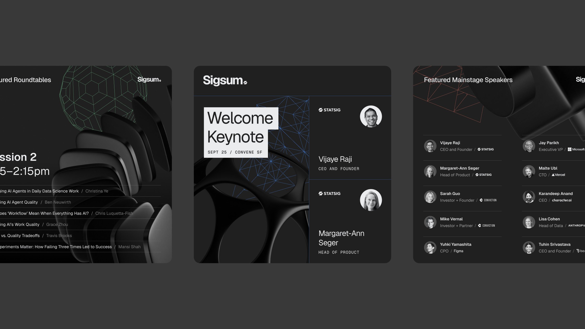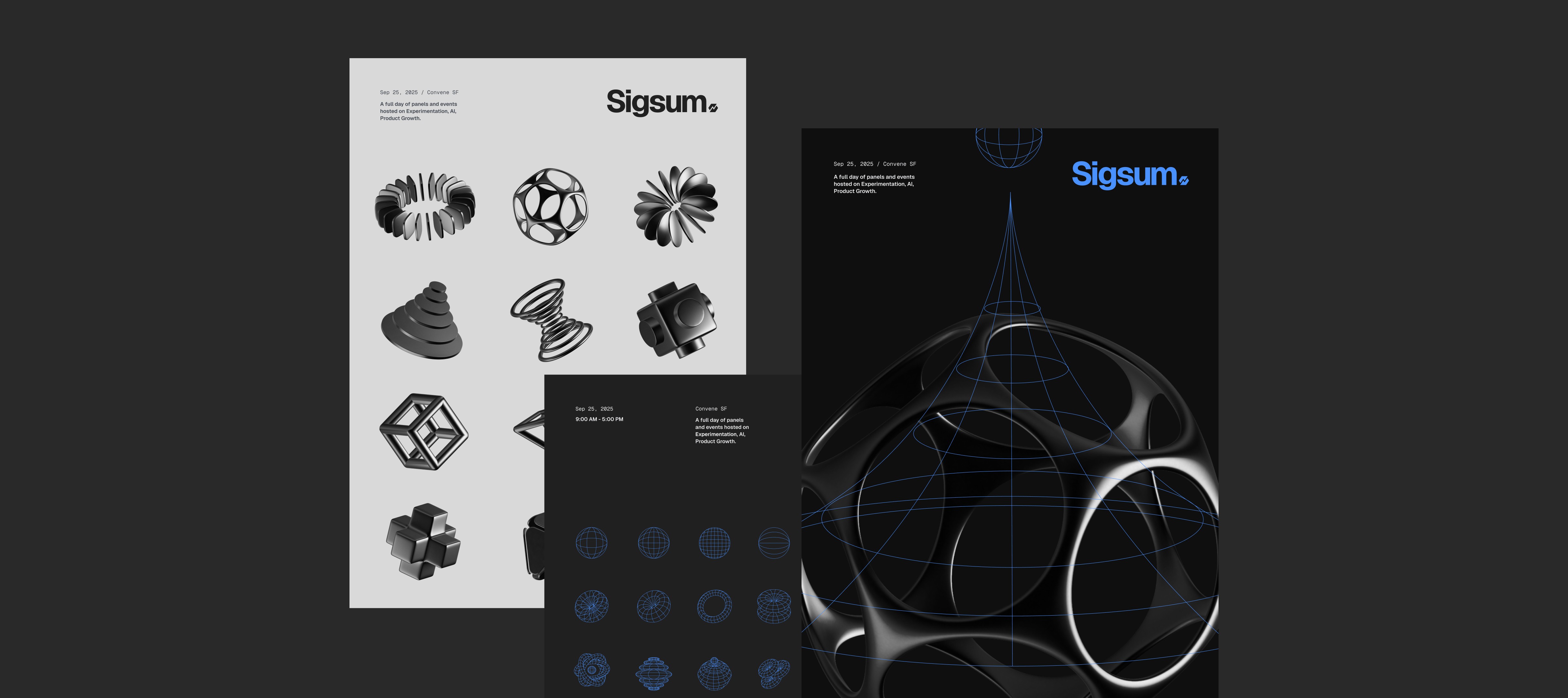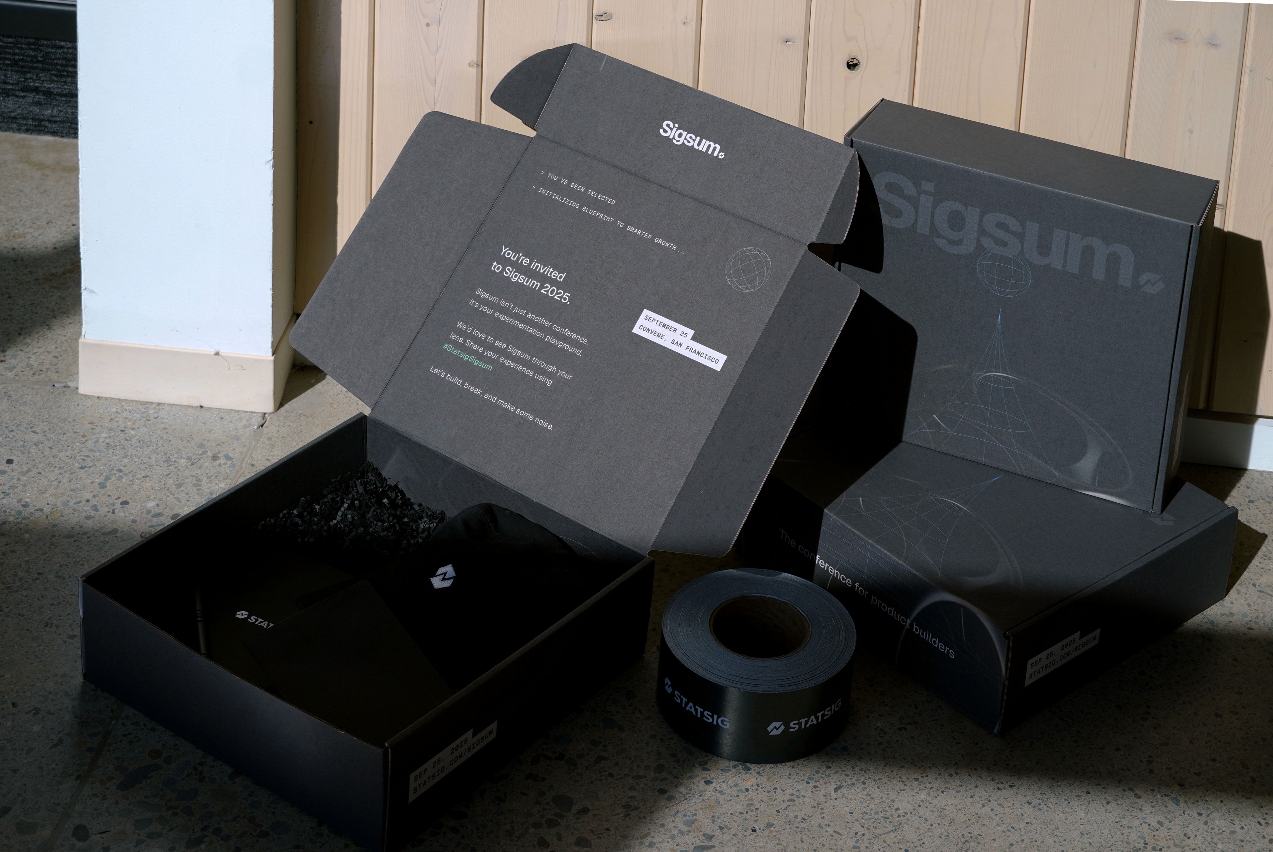 Sigsum is Statsig's annual conference for product builders. It brings together engineers, product leaders, and data teams focused on making better product decisions through experimentation tools. In 2025, the event housed 500 attendees around the theme "Blueprints for smarter growth," framing experimentation as a deliberate, structured process—especially in the context of AI-powered product building. I developed the event’s visual identity and led the creation of merchandise, influencer PR packages, as well as digital assets.